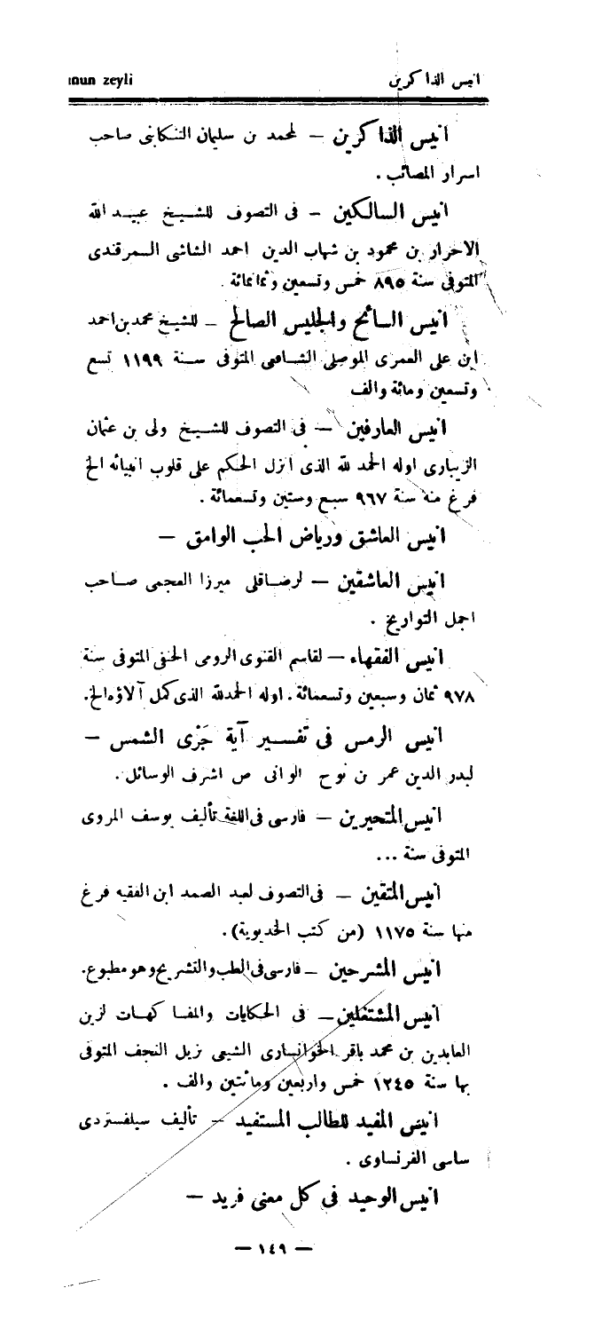 أنيس العارفين - في التصوف للشيخ ولي بن عثمان الزيباري اوله الحمدلله الذي أنزل الحكم على قلوب أنبيائه الخ فرغ منه سنة 967 سبع وستين وتسعمائة.