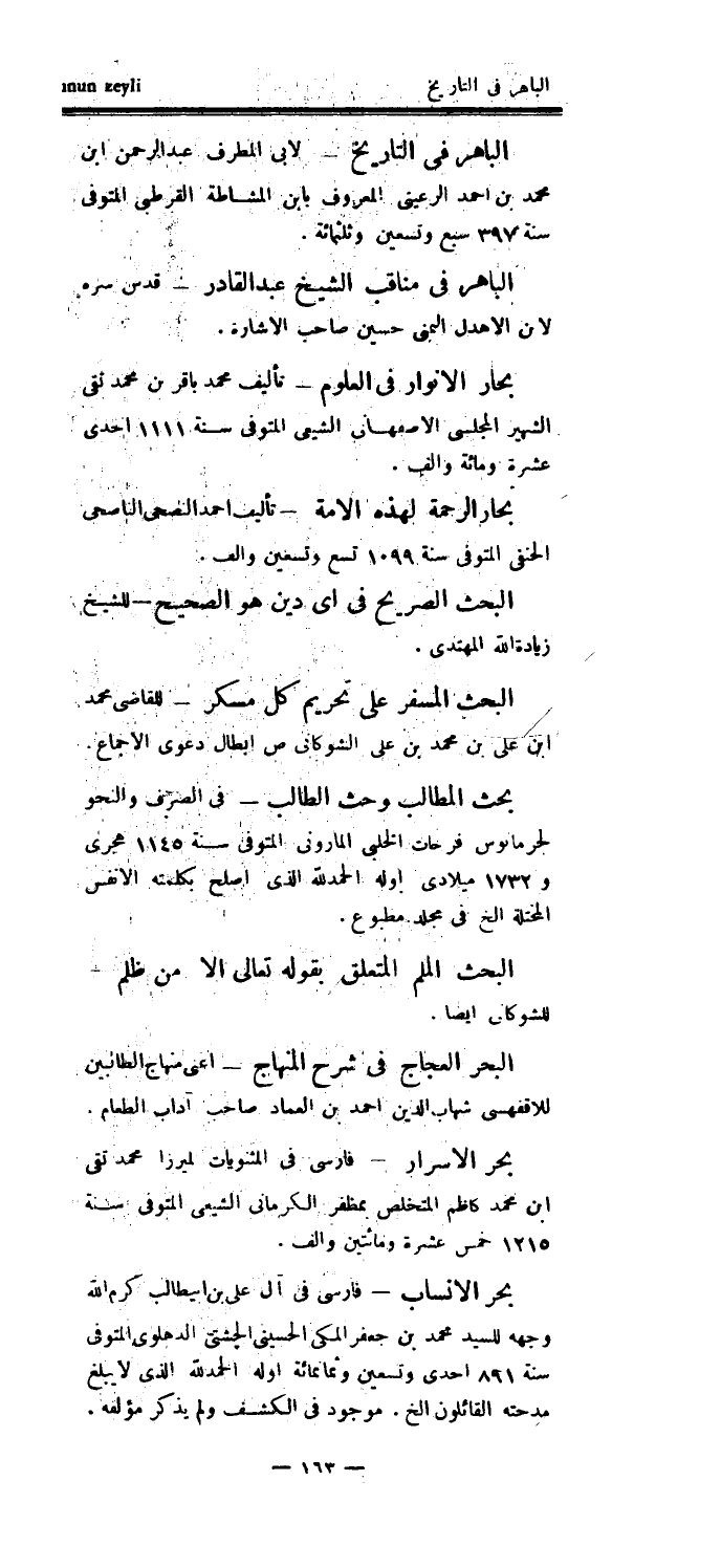 بحر الأنساب - فارسي في آل علي بن أبي طالب كرم الله وجهه للسيد محمد بن جعفر المكي الحسيني الچشتى الدهلوي المتوفى سنة 891 إحدى وتسعين وثمانمائة اوله الحمدلله الذي لا يبلغ مدحته القائلون الخ.