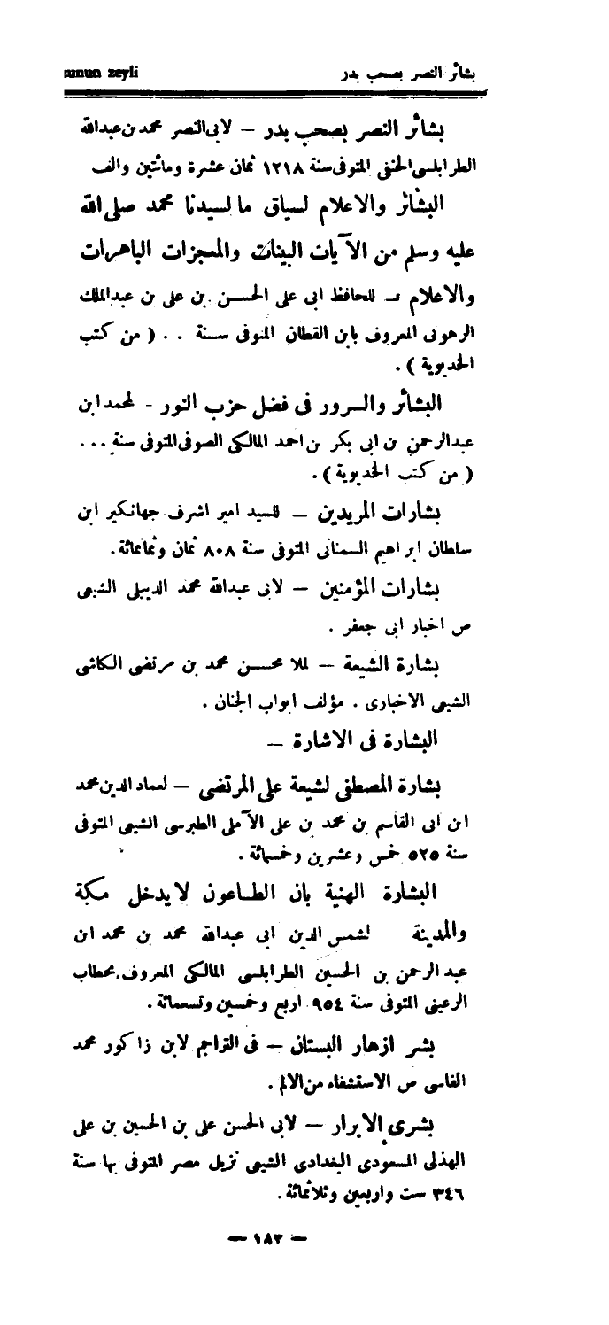 بشائر النصر بصحب بدر - لأبي النصر محمد بن عبد الله الطرابلسي الحنفي المتوفى سنة 1218 ثمان عشرة ومائتين وألف البشائر والإعلام لسياق ما لسيدنا محمد صلى الله عليه وسلم من الآيات البينات والمعجزات الباهرات والإعلام - للحافظ أبي علي الحسن بن علي بن عبد الملك الرهوني المعروف بابن القطان المتوفى سنة.. (من كتب الخديوية) .