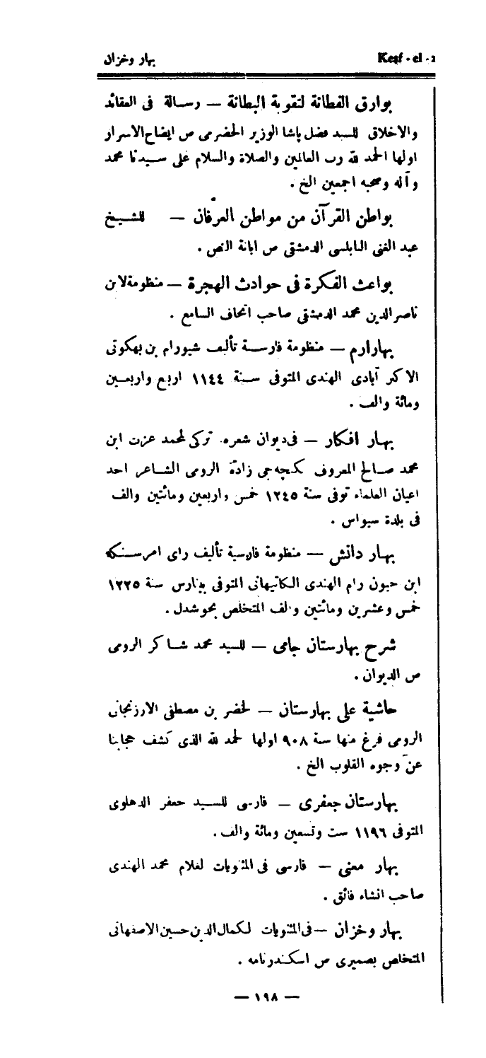 بهار دانش - منظومة فارسية تأليف راى امر سنكه ابن حيون رام الهندي الكاتيهاني المتوفى ببنارس سنة 1225 خمس وعشرين ومائتين وألف المتخلص بحوشدل.