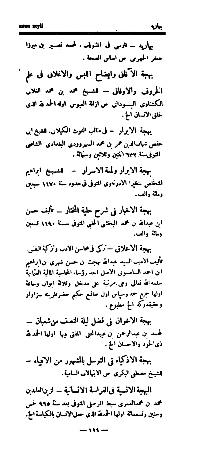 تأليف الاديب السيد عبد الله بهجت بن حسن شهري بن إبراهيم ابن أحمد السامسوني الأصل أحد رؤساء المحاسبة المالية العثمانية سلمه الله تعالى وهي مرتبة على مدخل وثلاثة أبواب وخاتمة أولها جميع حمد وسپاس أول صانع حكيم حضرتلرينه سزاوار وحقيقدركه الخ مطبوع.