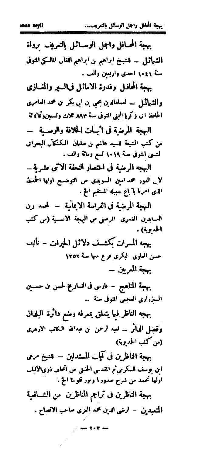بهجة المسرات بكشف دلائل الخيرات - تأليف حسن العلوي لبكري فرغ منها سنة 1252 بهجة المعربين - بهجة المناهج - فارسي في التاريخ لحسن بن حسين السبزواري العجمي المتوفى سنة.