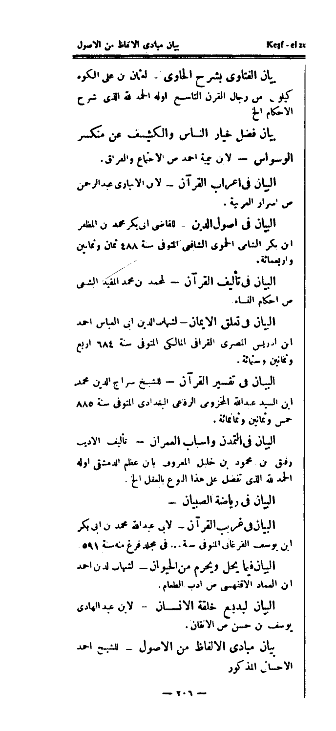 البيان في تأليف القرآن - لمحمد بن محمد المفيد الشيعي؟ ص أحكام النساء البيان في تعلق الايمان - لشهاب الدين أبي العباس أحمد ابن إدريس المصري القرافي المالكي المتوفى سنة 684 أربع وثمانين وستمائة.