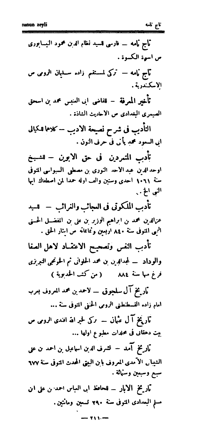 تأديب النفس وتصحيح الاعتقاد لأهل الصفا والوداد - لمجد الدين بن محمد الحلواني ثم الخونجي التبريزي فرغ منها سنة 884 (من كتب الخديوية) تاريخ آل سلجوق - لأحمد بن محمد المعروف بعرب إمام زاده القسطنطنى الرومي الحنفي المتوفى سنة..تاريخ آل عثمان - تركي لخير الله أفندي الرومي ص بيت دهقاني في مجلدات مطبوع أولها..تاريخ آمد - لشرف الدين إسماعيل بن أحمد بن علي الشيباني الأمدي المعروف بابن البيتي المحدث المتوفى سنة 677 سبع وسبعين وستمائة.
