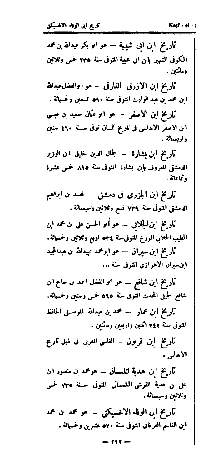 تاريخ ابن سيران - هو ابو محمد عبيد الله بن عبد المجيد ابن سيران الأهوازي المتوفى سنة..تاريخ ابن شافع - هو أبو الفضل أحمد بن صالح ابن شافع الجيلي المحدث المتوفى سنة 565 خمس وستين وخمسمائة.