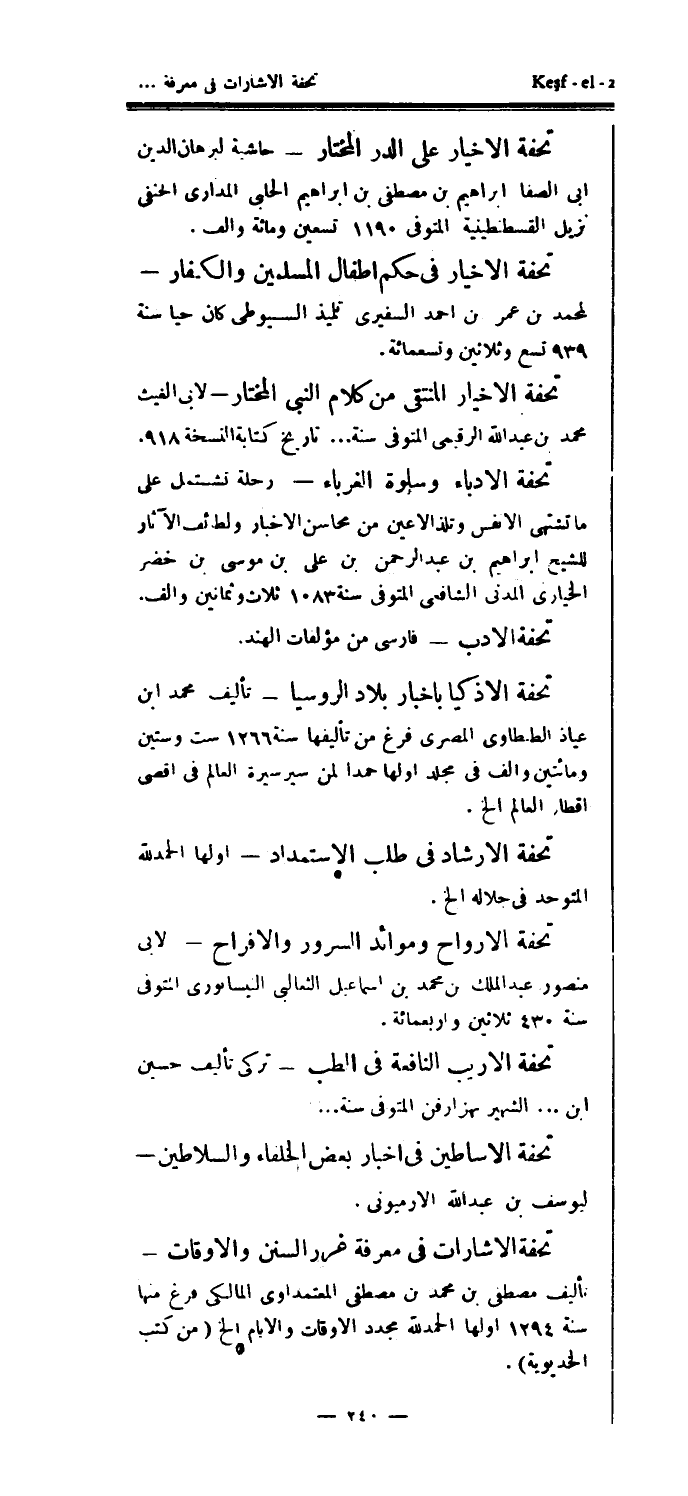 تحفة الإشارات في معرفة غرر السنن والأوقات - تأليف مصطفى بن محمد بن مصطفى المعتمداوي المالكي فرغ منها سنة 1294 اولها الحمدلله مجدد الأوقات والأيام الخ (من كتب الخديوية) .