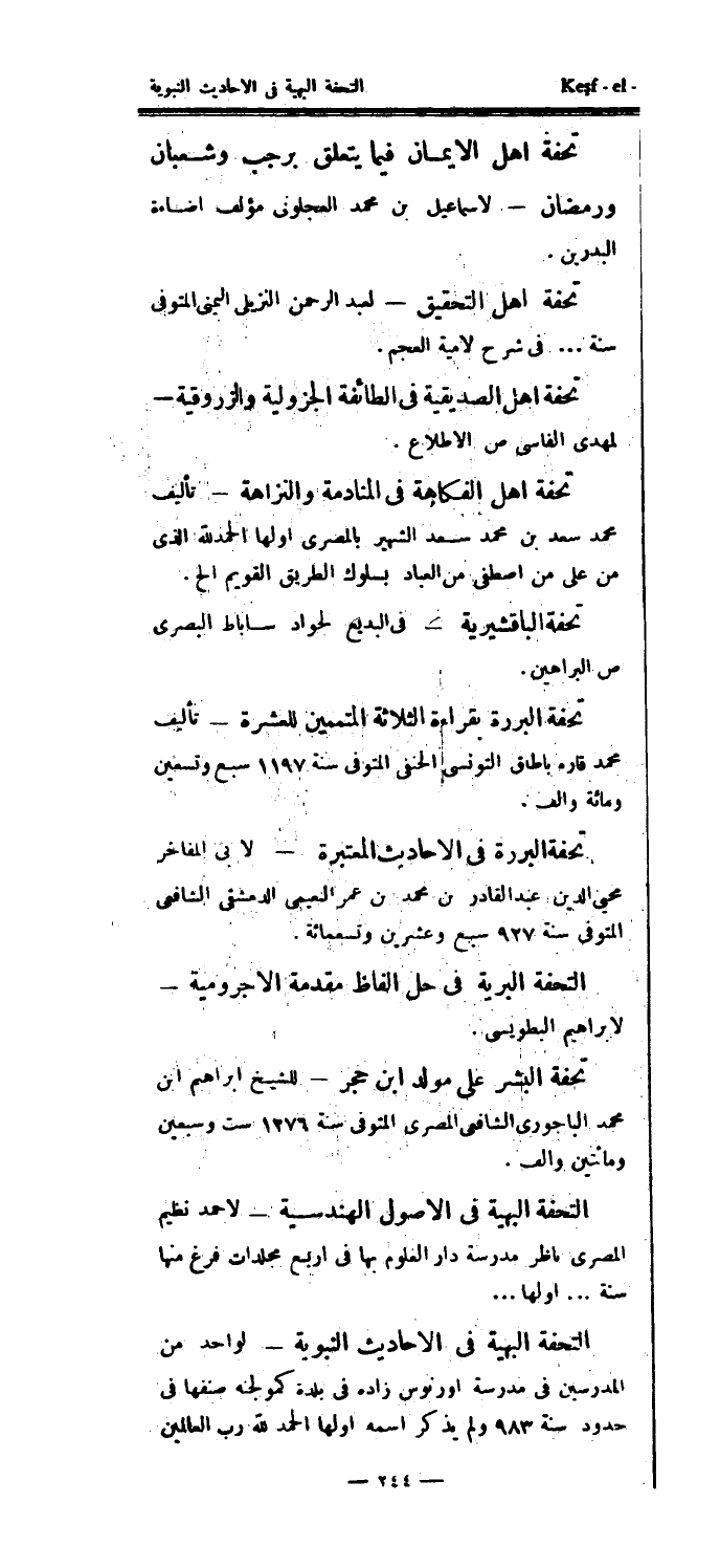 التحفة البهية في الأصول الهندسية - لأحمد نظيم المصري ناظر مدرسة دار العلوم بها في أربع مجلدات فرغ منها سنة..أولها..التحفة البهية في الأحاديث النبوية - لواحد من المدرسين في مدرسة أورنوس زاده في بلدة كمولجنه صنفها في حدود سنة 983 ولم يذكر اسمه أولها الحمدلله رب العالمين