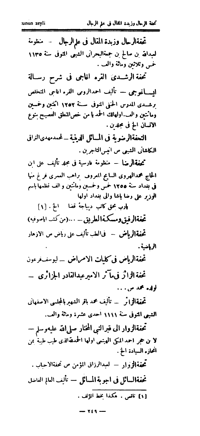 تحفة الرياض في كليات الأمراض - ليوسف فرعون تحفة الزائر في مآثر الأمير عبد القادر الجزائري - لولده محمد ص..تحفة الزائر - تأليف محمد باقر الشهير بالمجلسي الأصفهاني