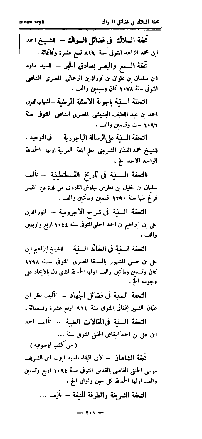 التحفة السنية في المقالات الطبية - تأليف أحمد ابن علي بن أحمد البقاعي الحنفي المتوفى سنة.. (من كتب أيا صوفيه) تحفة الشاهان - لأبي البقاء السيد أيوب ابن الشريف موسى الحنفي القاضي بالقدس المتوفى سنة 1094 أربع وتسعين