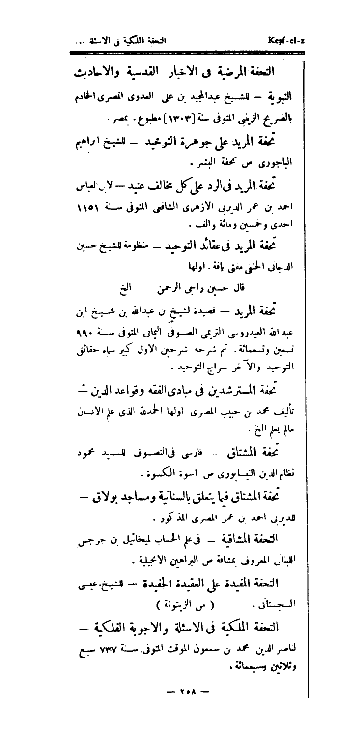 التحفة المرضية في الاخبار القدسية والاحاديث النبوية - للشيخ عبد المجيد بن علي العدوي المصري الخادم بالضريح الزينبي المتوفى سنة [1303] مطبوع.