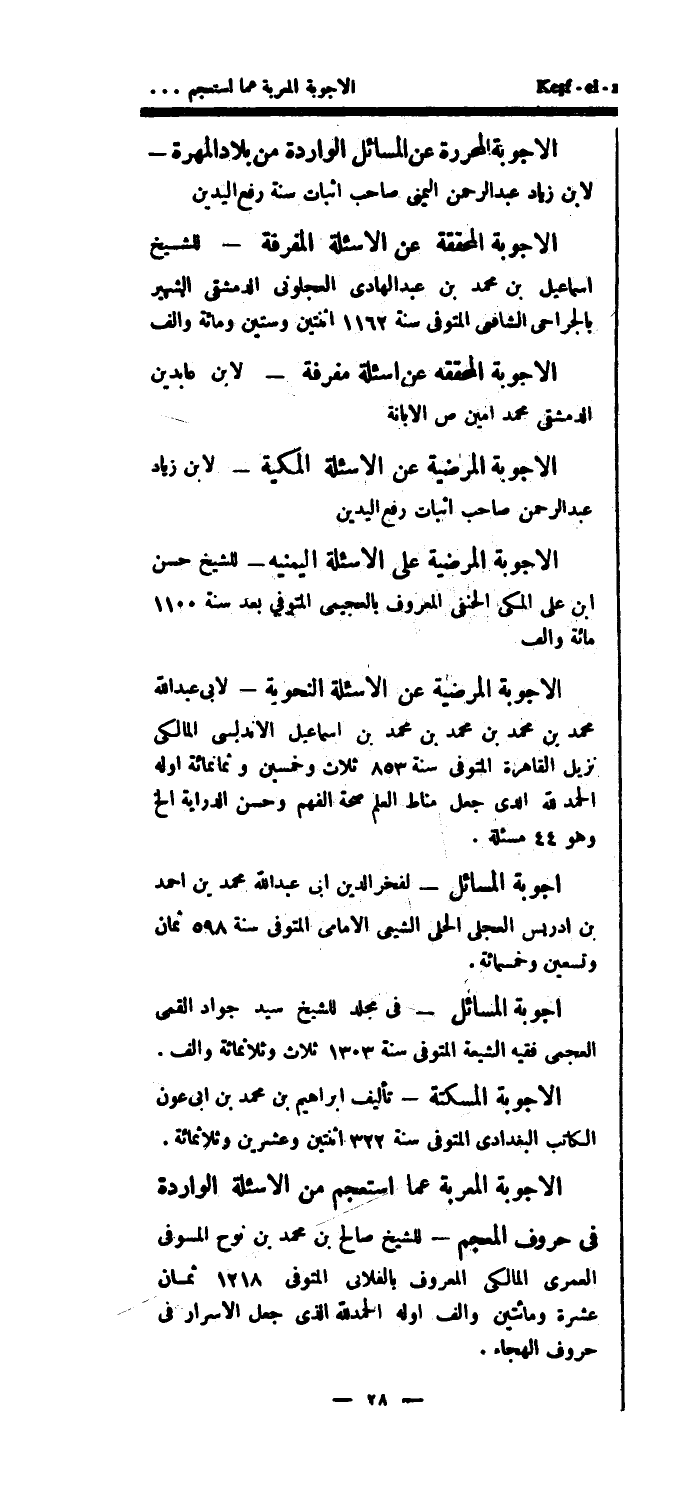الأجوبة المحررة عن المسائل الواردة من بلاد المهرة - لابن زياد عبد الرحمن اليمني صاحب إثبات سنة رفع اليدين الأجوبة المحققة عن الأسئلة المفرقة - للشيخ إسماعيل بن محمد بن عبد الهادي العجلوني الدمشقي الشهير بالجراحي الشافعي المتوفى سنة 1162 اثنتين وستين ومائة وألف الأجوبة المحققة عن أسئلة مفرفة - لابن عابدين الدمشقي محمد أمين ص الإبانة الأجوبة المرضية عن الأسئلة المكية - لابن زياد