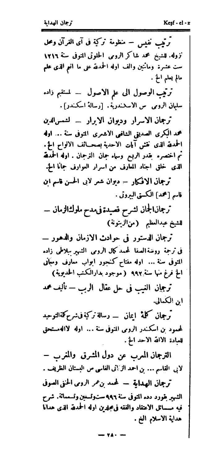 ترجمان الجمان لشرح قصيدة في مدح ملوك الزمان - للشيخ عبد العظيم (من الزيتونة) ترجمان الدستور في حوادث الأزمان والدهور - في ترجمة روضة الصفا لمحمد كمال الرومي الشهير ببلاطي زاده المتوفى سنة..أوله مفتاح كنجور أبواب معارف ومعاني الخ فرغ منها سنة 992 (موجود بدار الكتب الخديوية) ترجمان الغيب في حل عقال الريب - تأليف محمد ابن الكمالى.