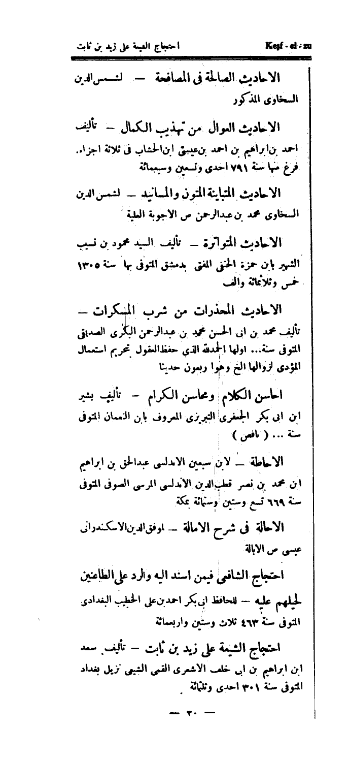 ابن أبي بكر الجعفري التبريزي المعروف بابن النعمان المتوفى سنة.. (؟ افص) الإحاطة - لابن سبعين الأندلسي عبد الحق بن إبراهيم ابن محمد بن نصر قطب الدين الأندلسي المرسي الصوفي المتوفى سنة 669 تسع وستين وستمائة بمكة الإحالة في شرح الإمالة - لموفق الدين الإسكندراني عيسى ص الإبالة احتجاج الشافعي فيمن أسند إليه والرد على الطاعنين لحيلهم عليه - للحافظ أبي بكر أحمد بن علي الخطيب البغدادي المتوفى سنة 463 ثلاث وستين وأربعمائة احتجاج الشيعة على زيد بن ثابت - تأليف سعد ابن إبراهيم بن أبي خلف الأشعري القمي الشيعي نزيل بغداد المتوفى سنة 301 إحدى وثلثمائة.