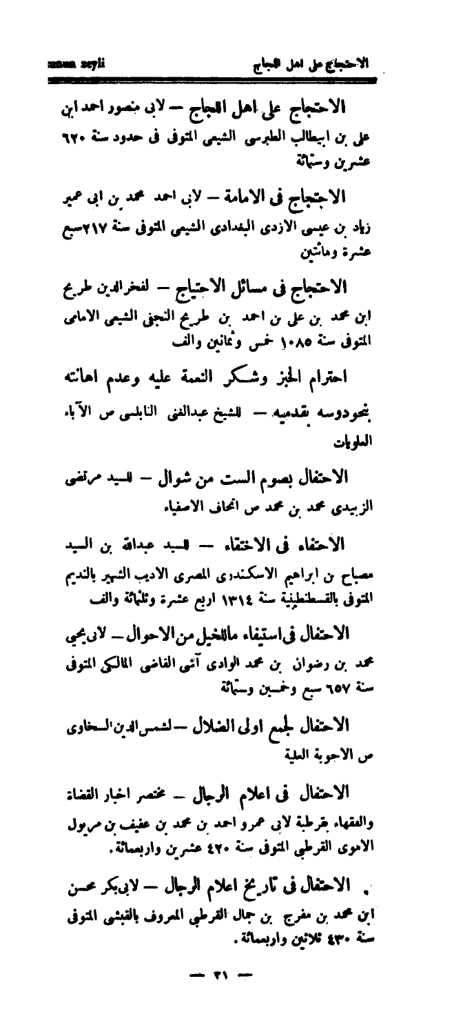 المتوفى سنة 1085 خمس وثمانين وألف احترام الخبز وشكر النعمة عليه وعدم اهانته بنحو دوسه بقدميه - للشيخ عبد الغنى النابلسي ص الآباء العلويات الاحتفال بصوم الست من شوال - للسيد مرتضى الزبيدي محمد بن محمد ص إتحاف الأصفياء الاحتفاء في الاختقاء - للسيد عبد الله بن السيد مصباح بن إبراهيم الإسكندري المصري الأديب الشهير بالنديم المتوفى بالقسطنطينية سنة 1314 أربع عشرة وثلثمائة وألف الاحتفال في استيفاء ما للخيل من الأحوال - لأبي يحيى محمد بن رضوان بن محمد الوادي آشى القاضي المالكي المتوفى سنة 657 سبع وخمسين وستمائة الاحتفال لجمع أولى الضلال - لشمس الدين السخاوي ص الأجوبة العلية الاحتفال في أعلام الرجال - مختصر أخبار القضاة والفقهاء بقرطبة لأبي عمرو أحمد بن محمد بن عفيف بن مريول الأموي القرطبي المتوفى سنة 420 عشرين وأربعمائة.