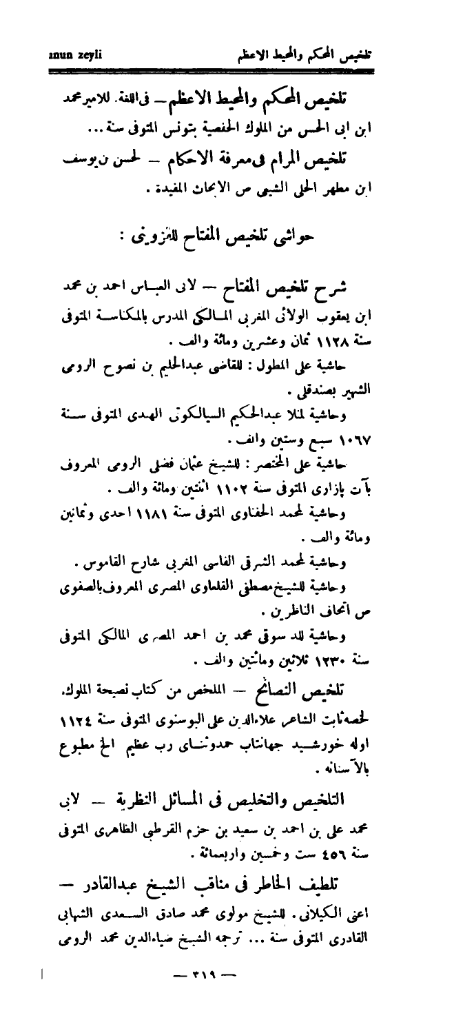 تلخيص المحكم والمحيط الأعظم - في اللغة للأمير محمد ابن أبي الحسن من الملوك الحفصية بتونس المتوفى سنة..تلخيص المرام في معرفة الأحكام - لحسن بن يوسف ابن مطهر الحلي الشيعي ص الأبحاث المفيدة.