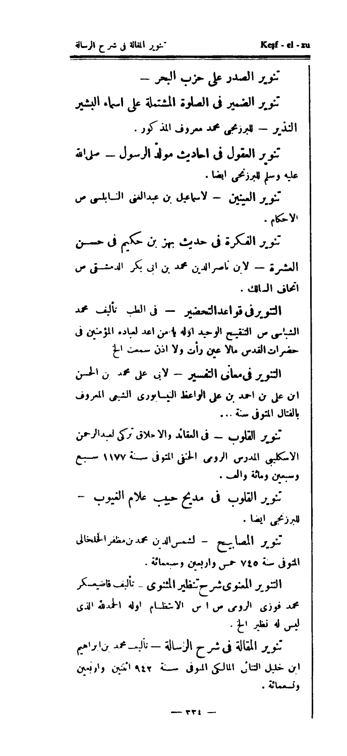 التنوير في قواعد التحضير - في الطب تأليف محمد الشباسي ص التنقيح الوحيد أوله يا من أعد لعباده المؤمنين في حضرات القدس ما لا عين رأت ولا أذن سمعت الخ التنوير في معاني التفسير - لأبي علي محمد بن الحسن ابن علي بن احمد بن علي الواعظ النيسابوري الشيعي المعروف بالفتال المتوفى سنة..تنوير القلوب - في العقائد والأخلاق تركي لعبد الرحمن الأسكليبي المدرس الرومي الحنفي المتوفى سنة 1177 سبع وسبعين ومائة وألف.