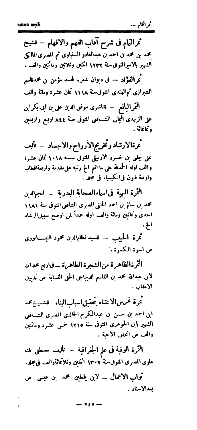 ثمر الفؤاد - في ديوان شعره لمحمد مؤمن بن محمد قاسم الشيرازي ثم الهندي المتوفى سنة 1118 ثمان عشرة ومائة وألف الثمر اليانع - للناشري موفق الدين علي بن أبي بكر ابن علي الزبيدي اليماني الشافعي المتوفى سنة 844 أربع وأربعين وثمانمائة.