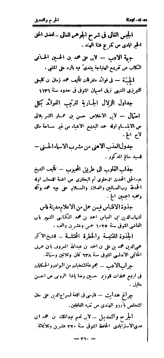 الجبة - في فوائد متفرقات تأليف محمد زمان بن كليعلى التبريزي الشيعي نزيل أصبهان المتوفى في حدود سنة 1131 جداول الزلال الجارية لترتيب الفوائد بكل احتمال - لأبي الإخلاص حسن بن عمار الشرنبلالي ص الابتسام أوله حمد البديع الأشياء من غير سامة مثل لاح إلخ.