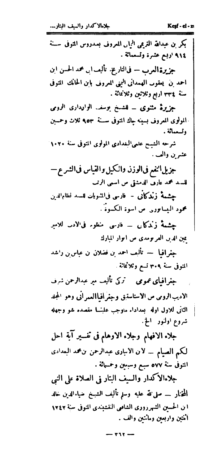 جزيل النفع في الوزن والكيل والقياس في الشرع - للسيد محمد عارف الدمشقي ص اسمى الرتب چشمهء زندكاني - فارسي في المثنويات للسيد نظام الدين محمود النيسابوري ص أسوة الكسوة.