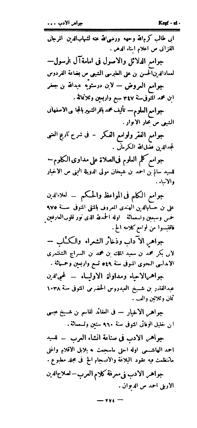 جوامع الكلم في المواعظ والحكم - لعلاء الدين علي بن حسام الدين الهندي المعروف بالمتقي المتوفى سنة 975 خمس وسبعين وتسعمائة اوله الحمدلله الذي نور قلوب العارفين فاقتبسوا من لوامع كلامه الخ.