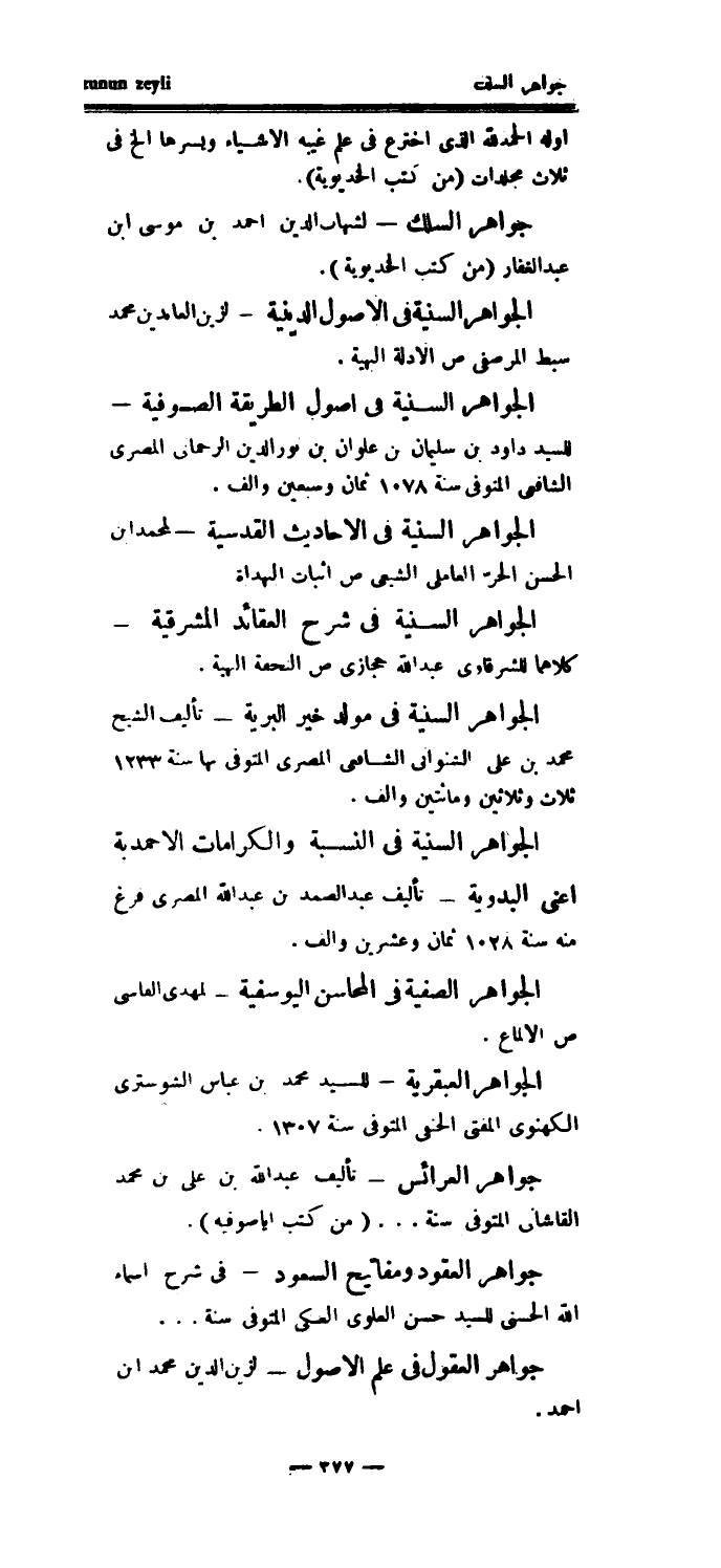 الجواهر السنية في النسبة والكرامات الاحمدية اعني البدرية - تأليف عبد الصمد بن عبد الله المصري فرغ منه سنة 1028 ثمان وعشرين وألف.