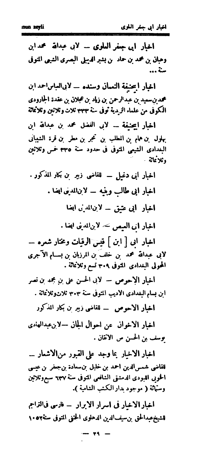 أخبار أبي جعفر العلوي - لأبي عبد الله محمد ابن وهبان بن محمد بن حماد بن بشير الديبلي البصري الشيعي المتوفى سنة..أخبار أبي حنيفة النعمان وسنده - لأبي العباس أحمد ابن محمد بن سعيد بن عبد الرحمن بن زياد بن عجلان بن عقدة الجارودي الكوفي من علماء الزيدية توفى سنة 333 ثلاث وثلاثين وثلاثمائة أخبار أبي حنيفة - لأبي الفضل محمد بن عبد الله ابن بهلول بن همام بن المطلب بن تجر بن مطر بن قرة الشيباني البغدادي الشيعي المتوفى في حدود سنة 335 خمس وثلاثين وثلاثمائة.