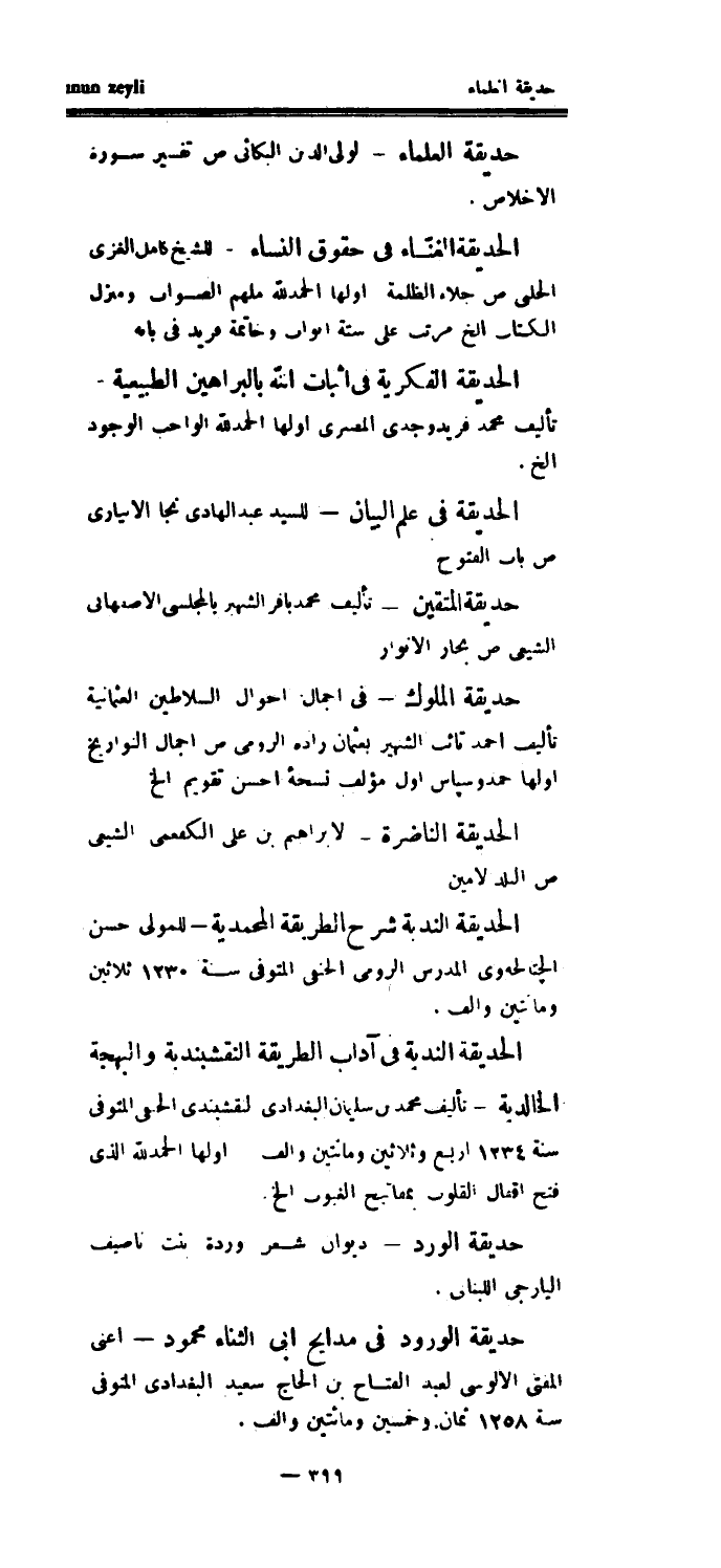 حديقة المتقين - تأليف محمد باقر الشهير بالمجلسي الأصفهاني الشيعي ص بحار الأنوار حديقة الملوك - في إجمال أحوال السلاطين العثمانية تأليف أحمد تائب الشهير بعثمان راده الرومي ص إجمال التواريخ اولها حمد وسپاس اول مؤلف نسخهء أحسن تقويم الخ الحديقة الناضرة - لإبراهيم بن علي الكفعمي الشيعي ص البلد لامين الحديقة الندبة شرح الطريقة المحمدية - للمولى حسن الچتالحه وي المدرس الرومي الحنفي المتوفى سنة 1230 ثلاثين ومائتين وألف.
