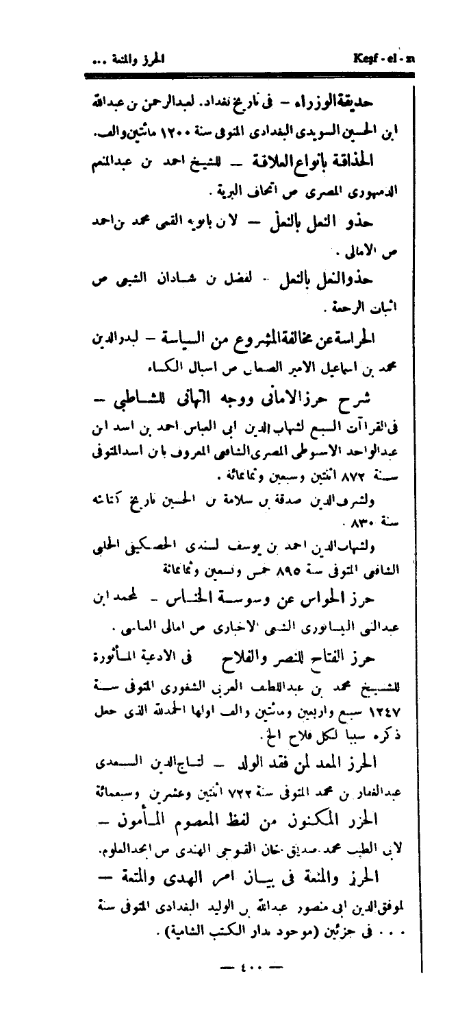 الحراسة عن مخالفة المشروع من السياسة - لبدر الدين محمد بن إسماعيل الامير الصنعاني ص أسبال الكساء شرح حرز الأماني ووجه التهاني للشاطبي - في القراآت السبع لشهاب الدين أبي العباس أحمد بن اسد ابن عبد الواحد الأسوطي المصري الشافعي المعروف بابن أسد المتوفى سنة 872 اثنتين وسبعين وثمانمائة.
