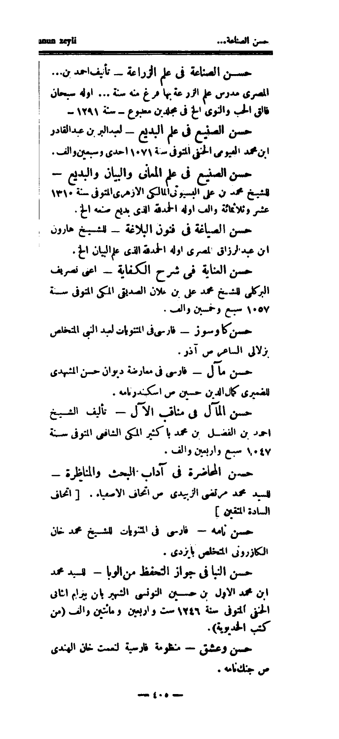 حسن الصناعة في علم الزراعة - تأليف أحمد بن..المصري مدرس علم الزرعة بها فرغ منه سنة..أوله سبحان فالق الحب والنوى الخ في مجلدين مطبوع - سنة 1291 - حسن الصنيع في علم البديع - لعبد البر بن عبد القادر ابن محمد الفيومي الحنفي المتوفى سنة 1071 إحدى وسبعين وألف.