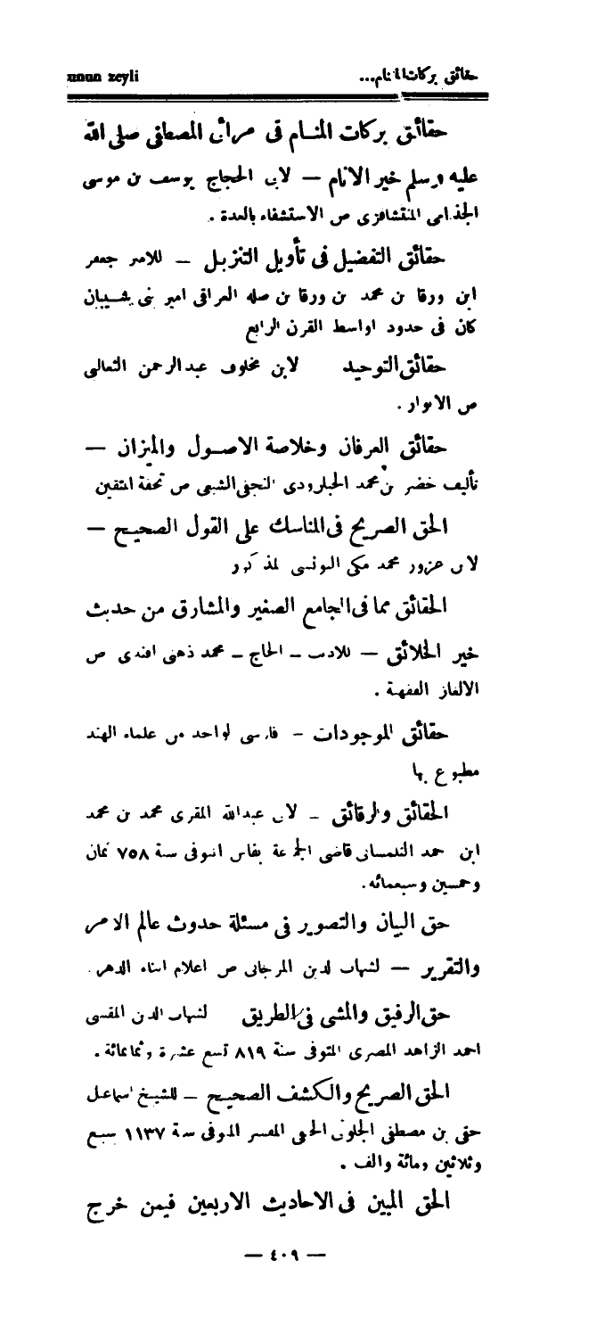 تأليف خضر بن محمد الحبلرودي النجفي الشيعي ص تحفة المتقين الحق الصريح في المناسك على القول الصحيح - لابن عزور محمد مكى ال؟ ونسى لمذكور الحقائق مما في الجامع الصغير والمشارق من حديث خير الخلائق - للأديب - الحاج - محمد ذهني أفندي ص الألغاز الفقهية.