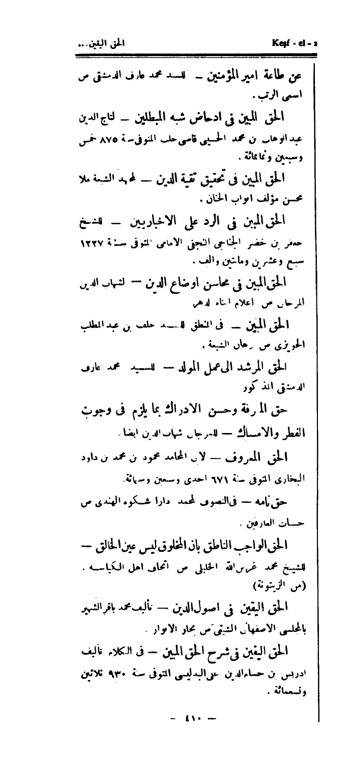 الحق المبين في محاسن أوضاع الدين - لشهاب الدين المرحاني ص اعلام ابناء لدهر الحق المبين - في المنطق للسيد حلف بن عبد المطلب الحويزي ص برهان الشيعة.