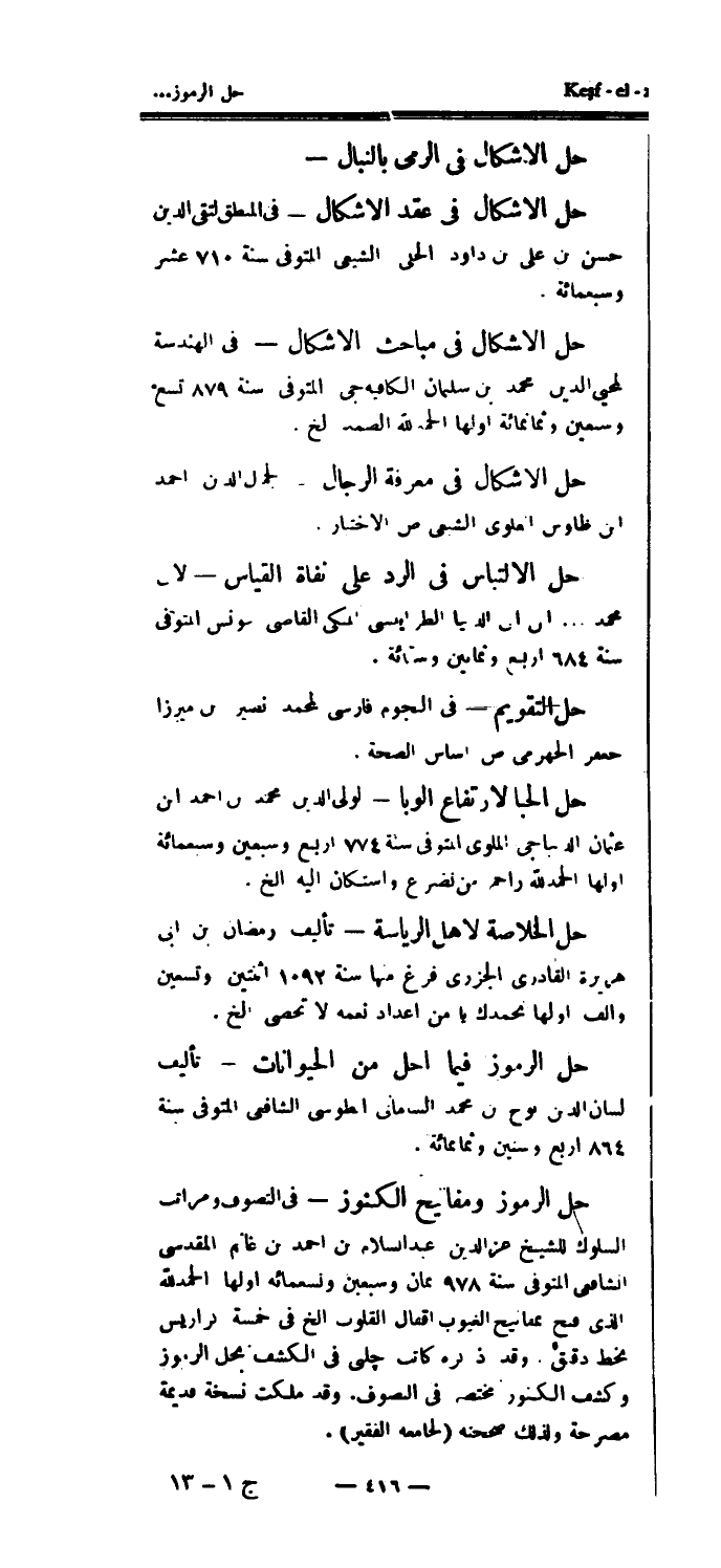 حل الإشكال في مباحث الأشكال - في الهندسة لمحيي الدين محمد بن سليمان الكافية جي المتوفى سنة 879 تسع وسبعين وثمانمائة أولها الحمدلله الصمد الخ.