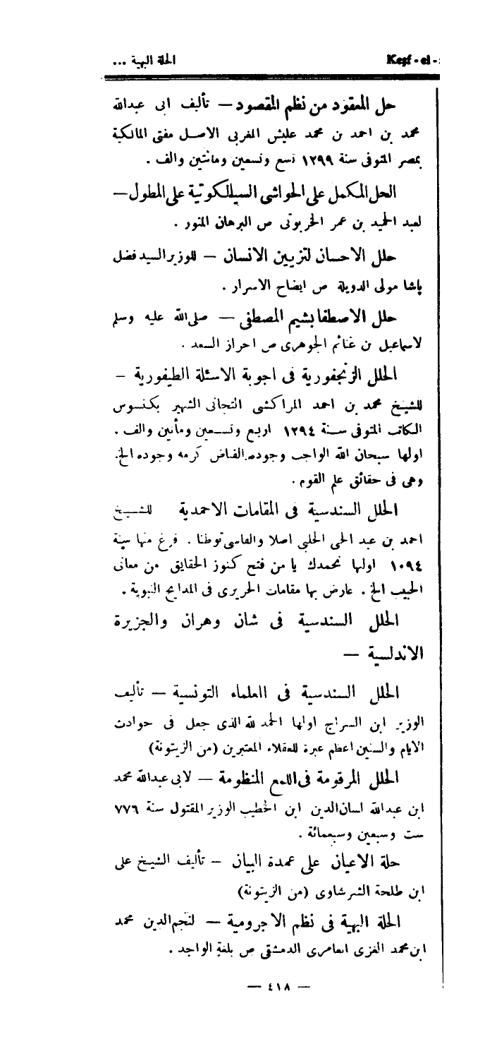 الحلل السندسية في شان وهران والجزيرة الأندلسية - الحلل السندسية في العلماء التونسية - تأليف الوزير ابن السراج اولها الحمدلله الذي جعل في حوادث الأيام والسنين أعظم عبرة للعقلاء المعتبرين (من الزيتونة) الحلل المرقومة في اللمع المنظومة - لأبي عبد الله محمد ابن عبد الله لسان الدين ابن الخطيب الوزير المقتول سنة 776 ست وسبعين وسبعمائة.