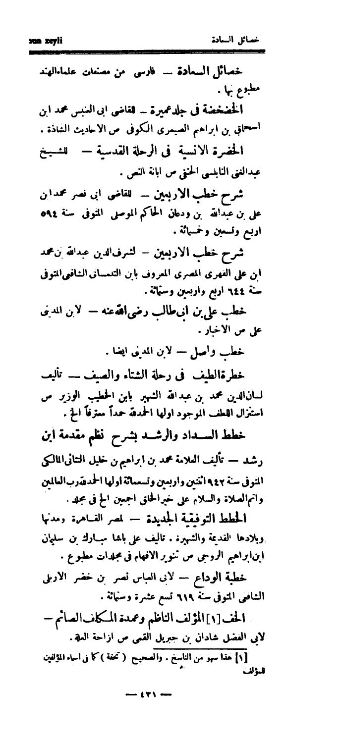 خصائل السعادة - فارسي من مصنفات علماء الهند مطبوع بها.