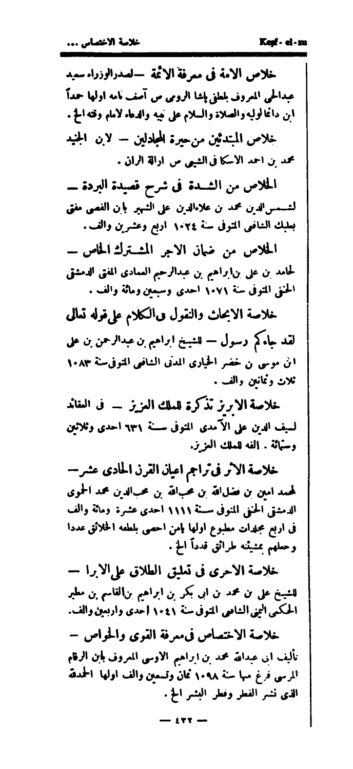 خلاصة الأثر في تراجم أعيان القرن الحادي عشر - لمحمد أمين بن فضل الله بن محب الله بن محب الدين محمد الحموي الدمشقي الحنفي المتوفى سنة 1111 إحدى عشرة ومائة وألف في أربع مجلدات مطبوع اولها يامن أحصى بلطفه الخلائق عددا وحعلهم بمشيئنه طرائق قدداً الخ.