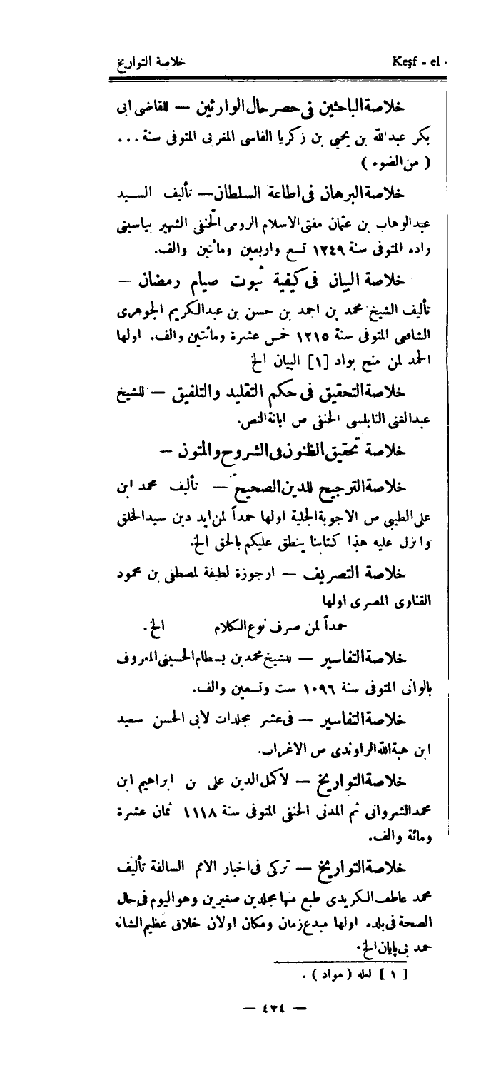 خلاصة الباحثين في حصر حال الوارثين - للقاضي أبي بكر عبد الله بن يحيى بن زكريا الفاسي المغربي المتوفى سنة.. (من الضوء) خلاصة البرهان في إطاعة السلطان - تأليف السيد عبد الوهاب بن عثمان مفتي الإسلام الرومي الحنفي الشهير بياسيني زاده المتوفى سنة 1249 تسع وأربعين ومائتين وألف.