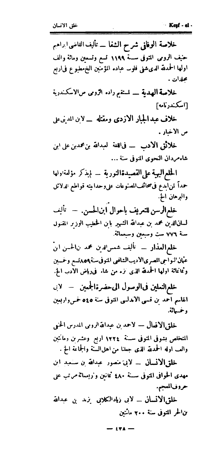خلاصة الوفافي شرح الشفا - تأليف القاضي إبراهيم حنيف الرومي المتوفى سنة 1199 تسع وتسعين ومائة وألف اولها الحمدلله الدى شفى قلوب عباده المؤمنين الخ مطبوع في أربع مجلدات.