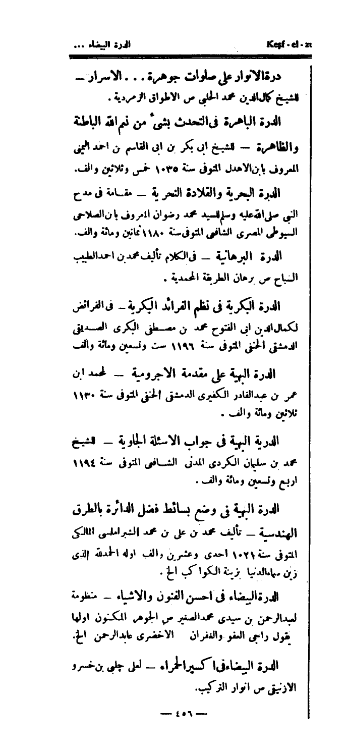 الدرة البكرية في نظم الفرائد البكرية - في الفرائض لكمال الدين أبي الفتوح محمد بن مصطفى البكري الصديقي الدمشقي الحنفي المتوفى سنة 1196 ست وتسعين ومائة وألف الدرة البهية على مقدمة الاجرومية - لمحمد ابن عمر بن عبد القادر الكفيري الدمشقي الحنفي المتوفى سنة 1130 ثلاثين ومائة وألف.