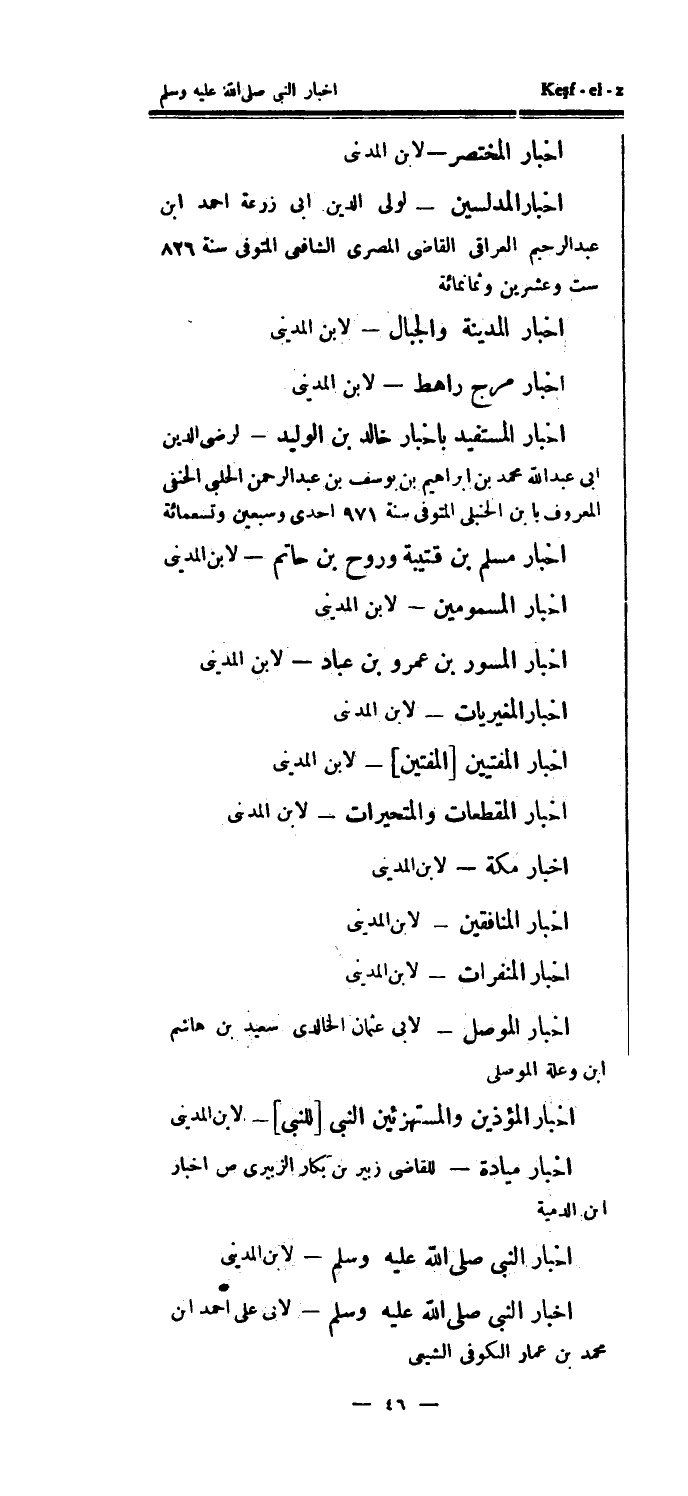 أخبار المختصر - لابن المديني أخبار المدلسين - لولي الدين أبي زرعة أحمد ابن عبد الرحيم العراقي القاضي المصري الشافعي المتوفى سنة 826 ست وعشرين وثمانمائة أخبار المدينة والجبال - لابن المديني أخبار مرج راهط - لابن المديني أخبار المستفيد بأخبار خالد بن الوليد - لرضى الدين ابي عبد الله محمد بن إبراهيم بن يوسف بن عبد الرحمن الحلبي الحنفي المعروف بابن الحنبلي المتوفى سنة 971 إحدى وسبعين وتسعمائة أخبار مسلم بن قتيبة وروح بن حاتم - لابن المديني أخبار المسمومين - لابن المديني أخبار المسور بن عمرو بن عباد لابن المديني أخبار المغيريات - لابن المديني أخبار المفتيين [المفتين]- لابن المديني أخبار المقطعات والمتحيرات - لابن المديني أخبار مكة - لابن المديني أخبار المنافقين - لابن المديني أخبار المنفرات - لابن المديني أخبار الموصل - لأبي عثمان الخالدي سعيد بن هاشم