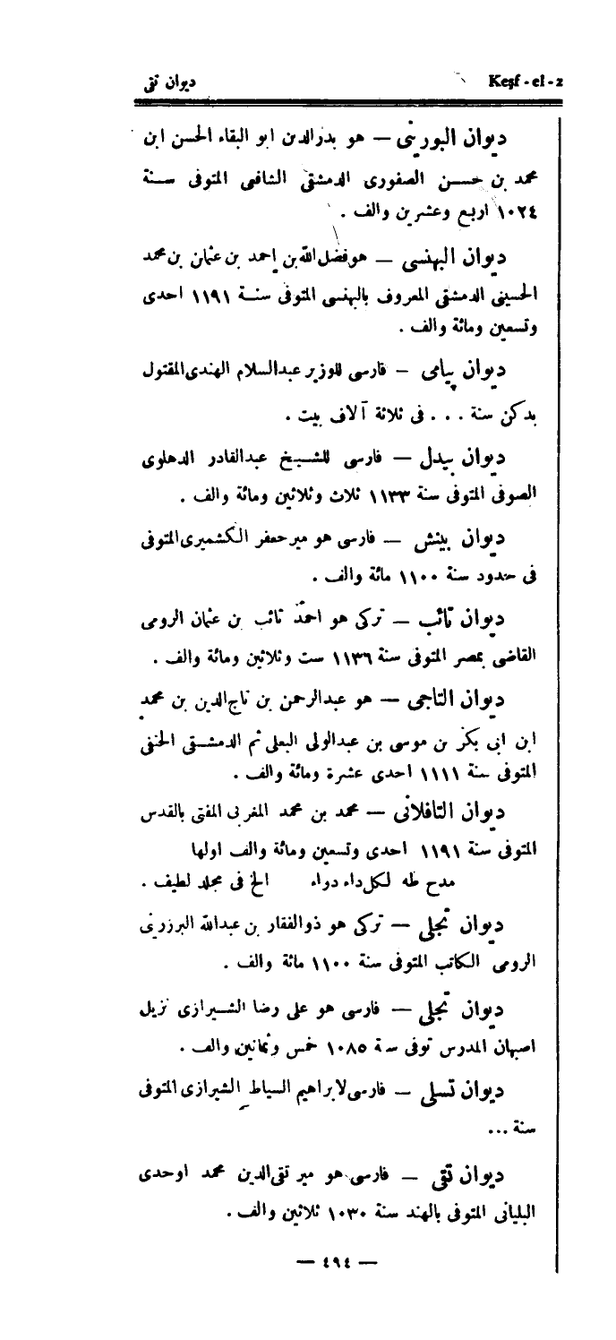 ديوان تسلى - فارسي لإبراهيم السياط الشيرازي المتوفى سنة..ديوان تقي - فارسي هو مير تقي الدين محمد أوحدي البلياني المتوفى بالهند سنة 1030 ثلاثين وألف.
