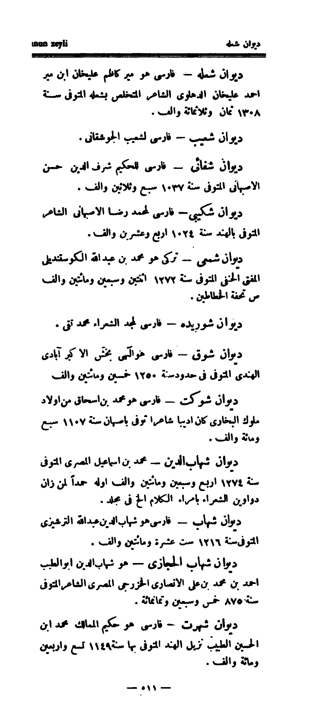 ديوان شوق - فارسي هو آلهي بخش الأكبر آبادي الهندي المتوفى في حدود سنة 1250 خمسين ومائتين وألف ديوان شوكت - فارسي هو محمد بن إسحاق من أولاد ملوك البخاري كان أديباً شاعراً توفي بأصبهان سنة 1107 سبع ومائة وألف.