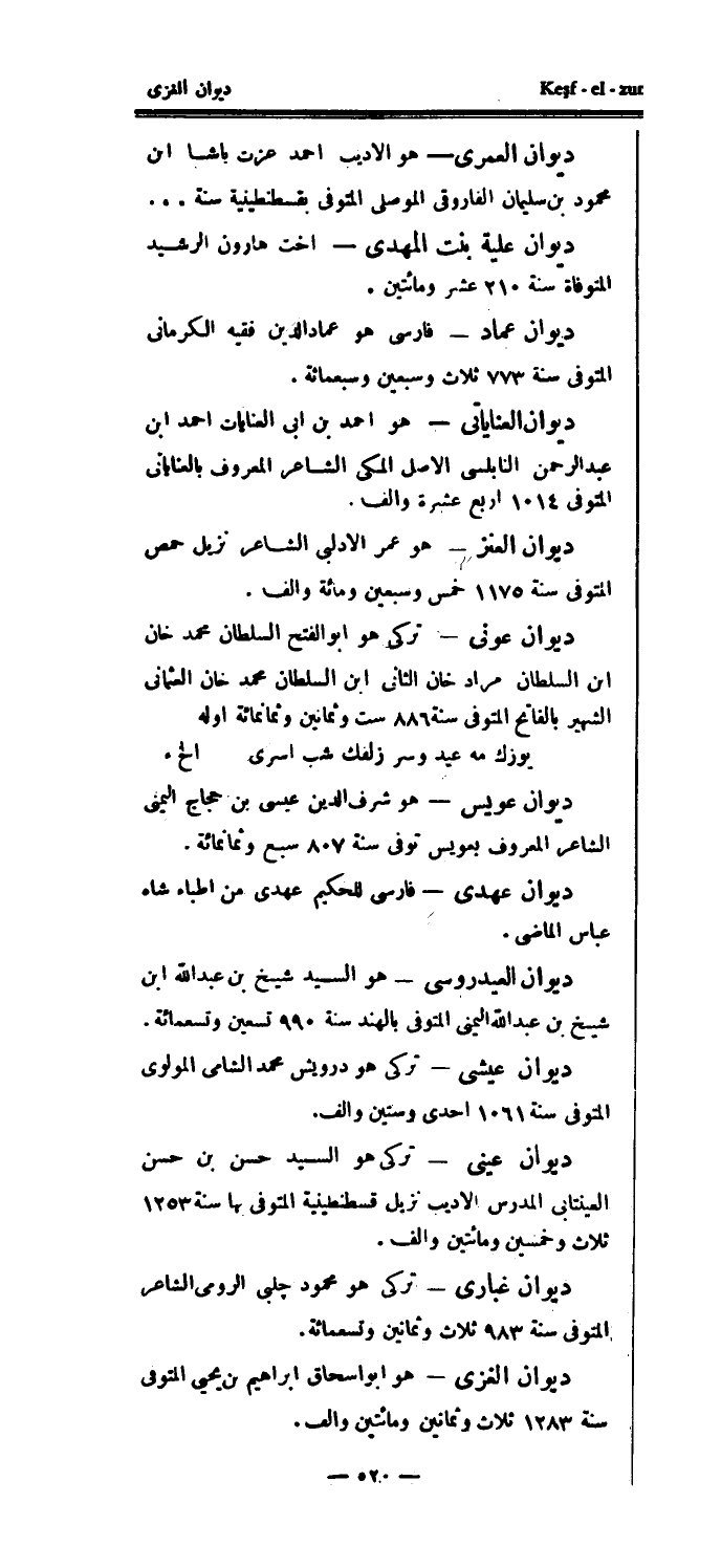 ديوان العمري - هو الأديب أحمد عزت باشا ابن محمود بن سليمان الفاروقي الموصلي المتوفى بقسطنطينية سنة..ديوان علية بنت المهدي - أخت هارون الرشيد المتوفاة سنة 210 عشر ومائتين.