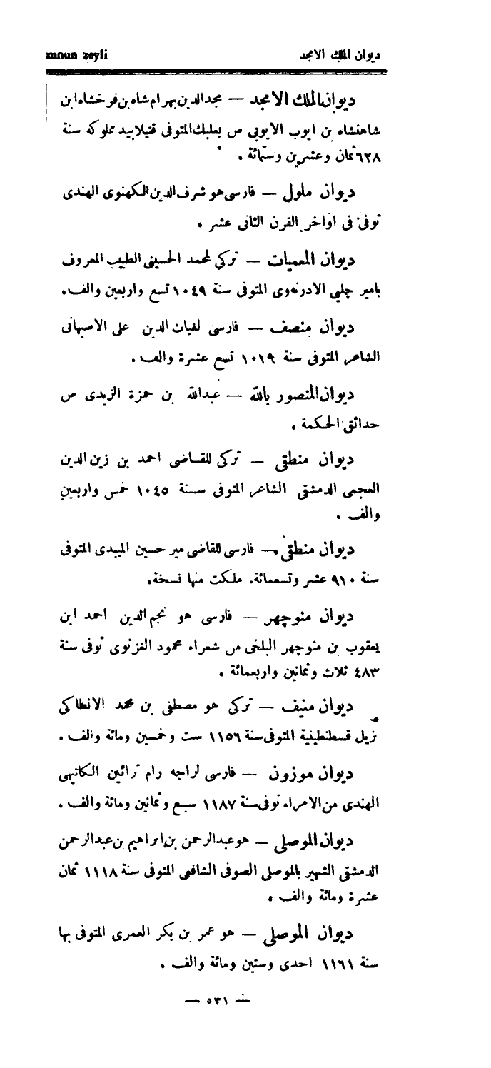 ديوان الموصلي - هو عمر بن بكر العمري المتوفى بها سنة 1161 إحدى وستين ومائة وألف.