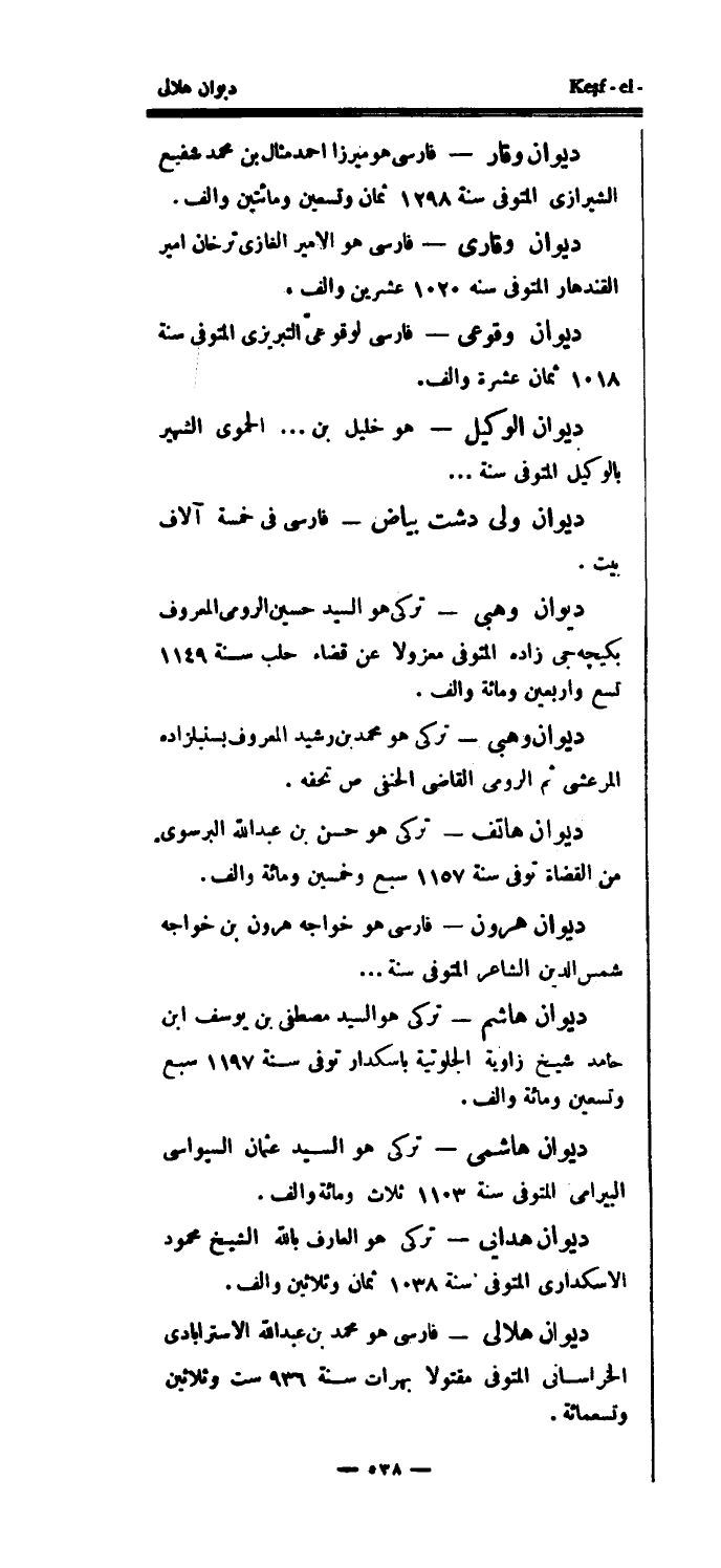 ديوان هلالي - فارسي هو محمد بن عبد الله الاسترابادي الخراساني المتوفى مقتولاً بهرات سنة 936 ست وثلاثين وتسعمائة.