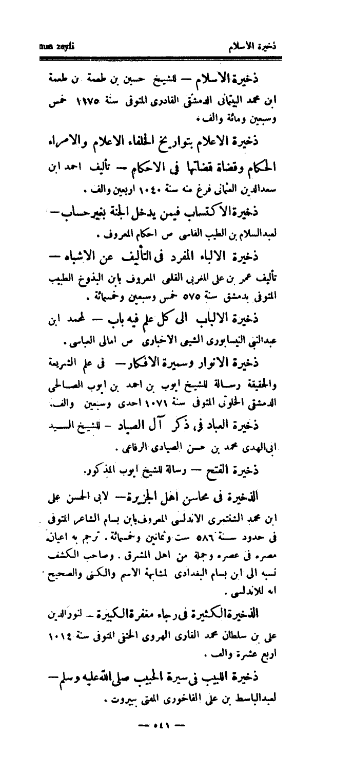 ذخيرة الإسلام - للشيخ حسين بن طعمة بن طعمة ابن محمد البيتماني الدمشقي القادري المتوفى سنة 1175 خمس وسبعين ومائة وألف.