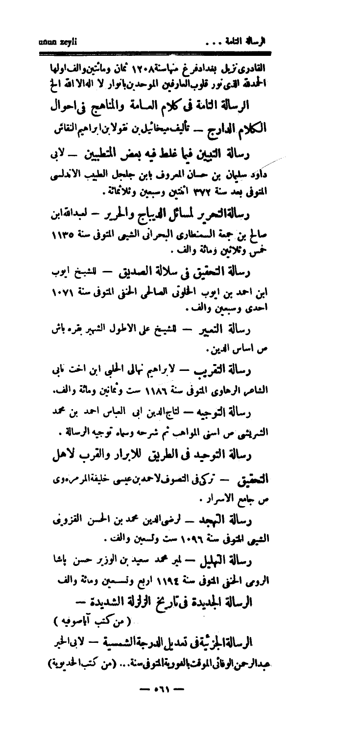 القادري نزيل بغداد فرغ منها سنة 1208 ثمان ومائتين وألف اولها الحمدلله الذي نور قلوب العارفين الموحدين بأنوار لا إله إلا الله الخ الرسالة التامة في كلام العامة والمناهج في أحوال الكلام الدارج - تأليف ميخائيل بن نقولا بن إبراهيم النقاش رسالة التبيين فيما غلط فيه بعض المتطببين - لأبي