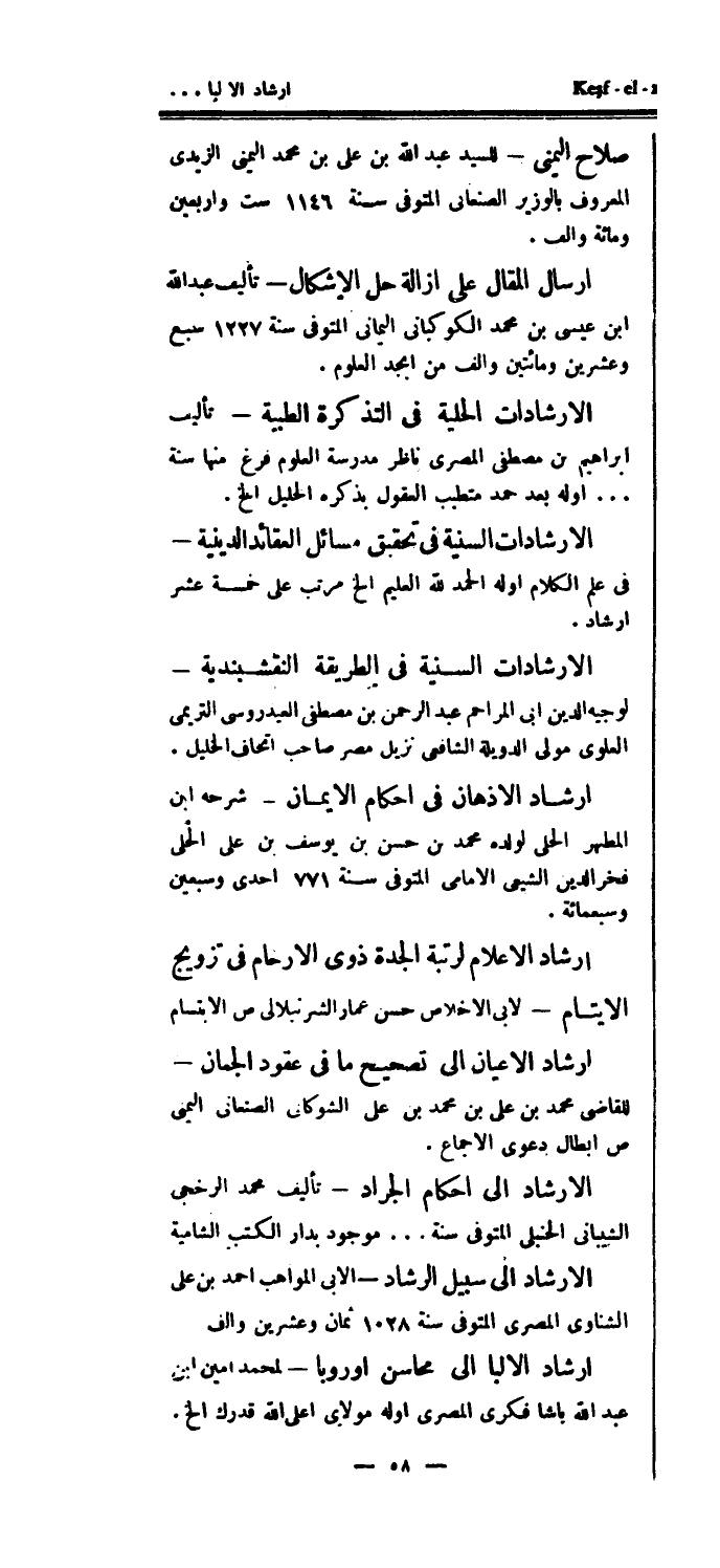 الإرشاد إلى أحكام الجراد - تأليف محمد الرخجى الشيباني الحنبلي المتوفى سنة..موجود بدار الكتب الشامية الإرشاد إلى سبيل الرشاد - الابى المواهب أحمد بن علي الشناوي المصري المتوفى سنة 1028 ثمان وعشرين وألف إرشاد الألبا إلى محاسن أوروبا - لمحمد أمين ابن عبد الله باشا فكري المصري أوله مولاي أعلى الله قدرك الخ.
