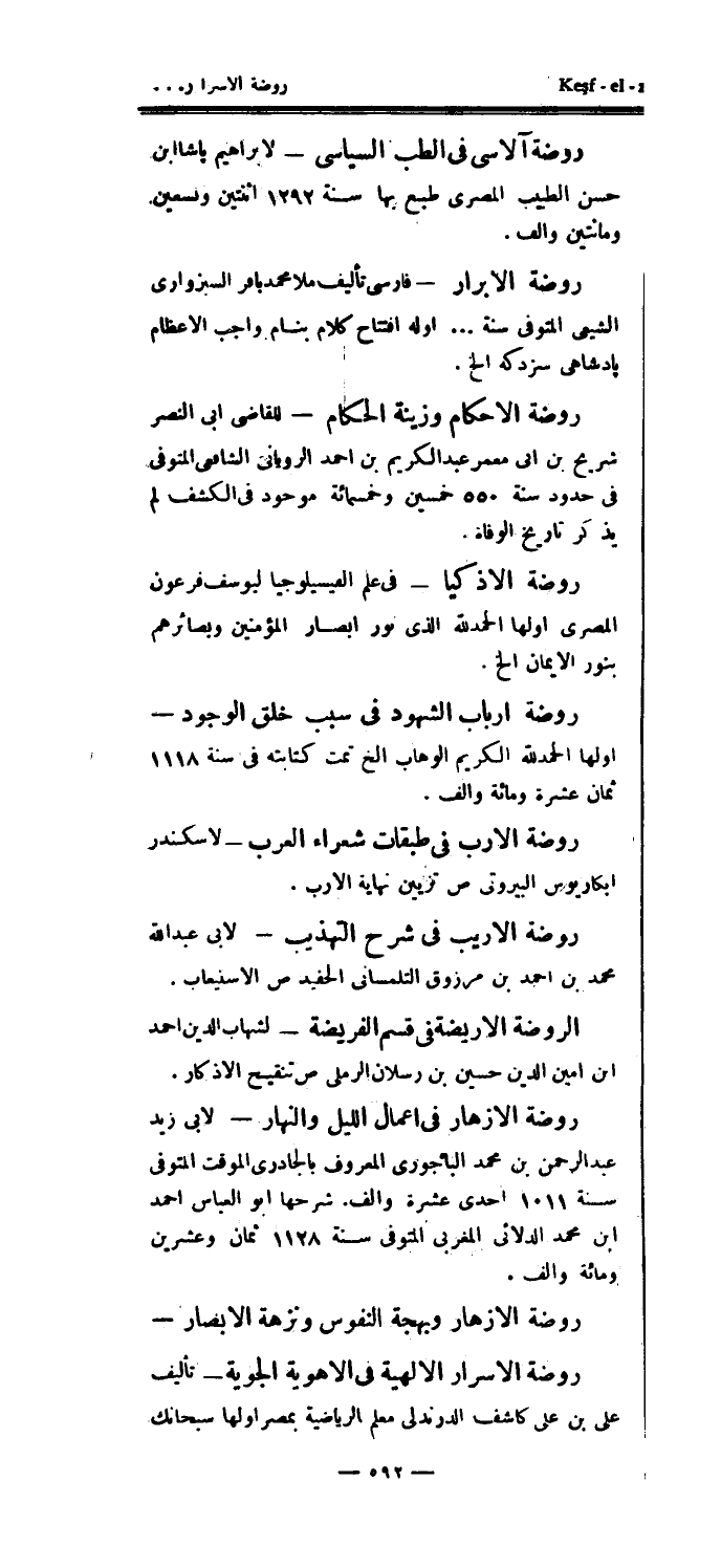 روضة آلاسى في الطب السياسي - لإبراهيم پاشا ابن حسن الطبيب المصري طبع بها سنة 1292 اثنتين وتسعين