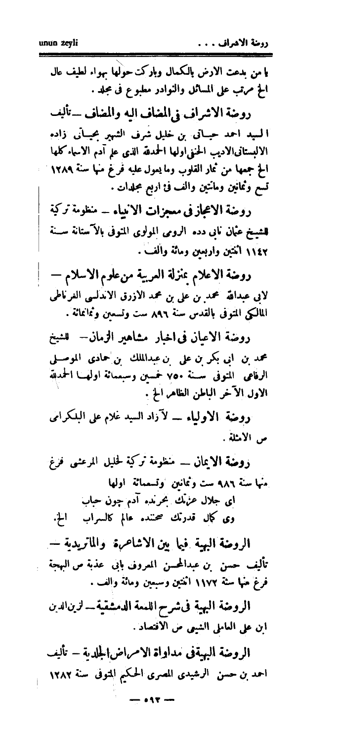 روضة الأشراف في المضاف إليه والمضاف - تأليف السيد أحمد حياتي بن خليل شرف الشهير بحياتي زاده الألبستاني الأديب الحنفي أولها الحمدلله الذي علم آدم الأسماء كلها الخ جمعها من ثمار القلوب وما يعول عليه فرغ منها سنة 1289 تسع وثمانين ومائتين وألف في أربع مجلدات.