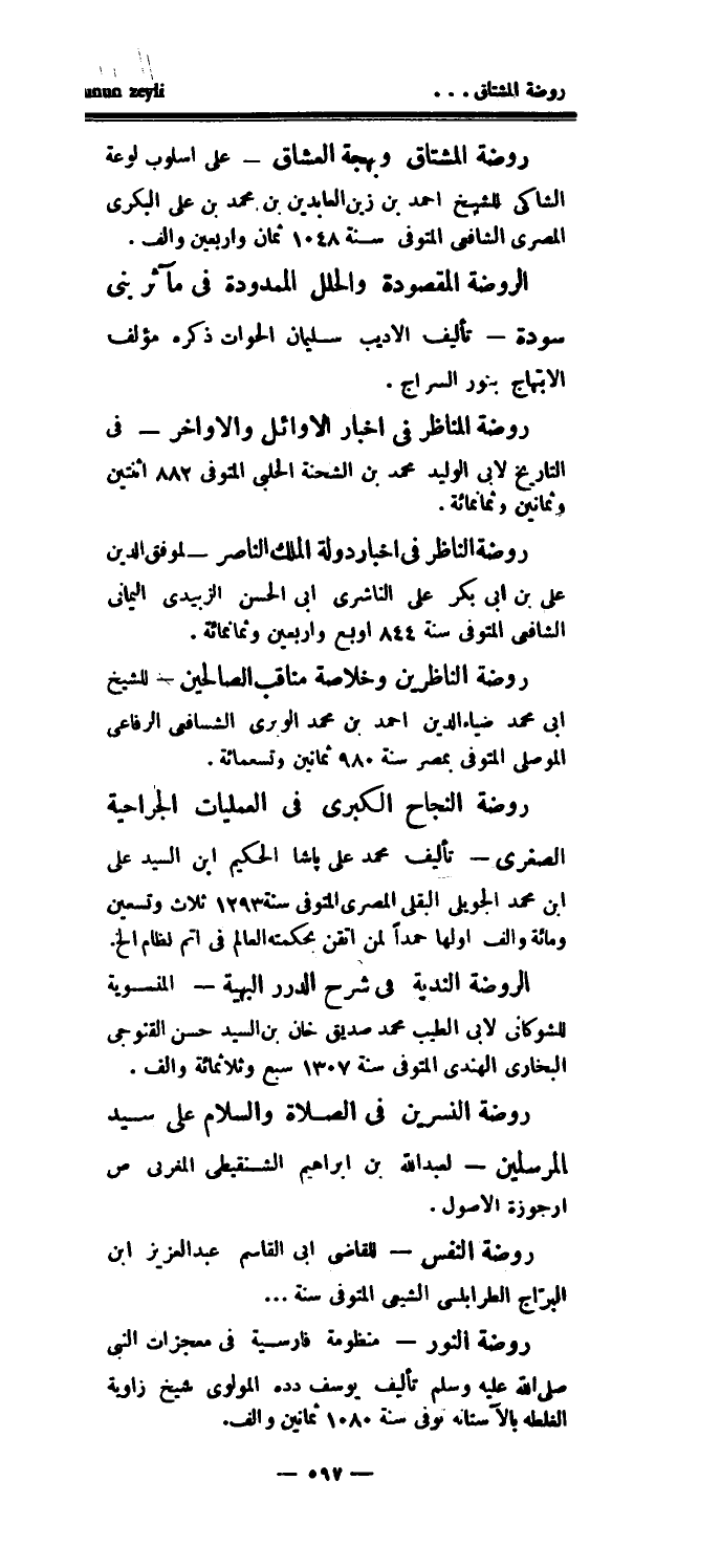 روضة النفس - للقاضي أبي القاسم عبد العزيز ابن البراج الطرابلسي الشيعي المتوفى سنة..روضة النور - منظومة فارسية في معجزات النبي صلى الله عليه وسلم تأليف يوسف دده المولوي شيخ زاوية الغلطة بالآستانة توفي سنة 1080 ثمانين وألف.
